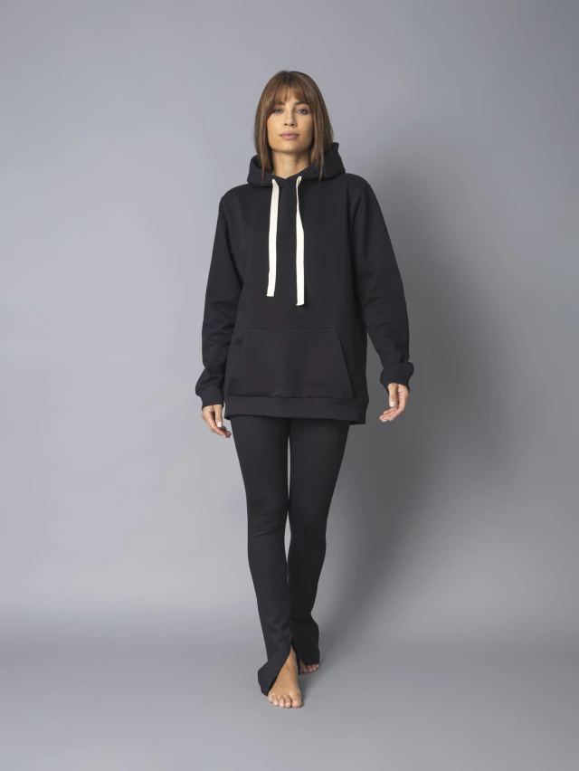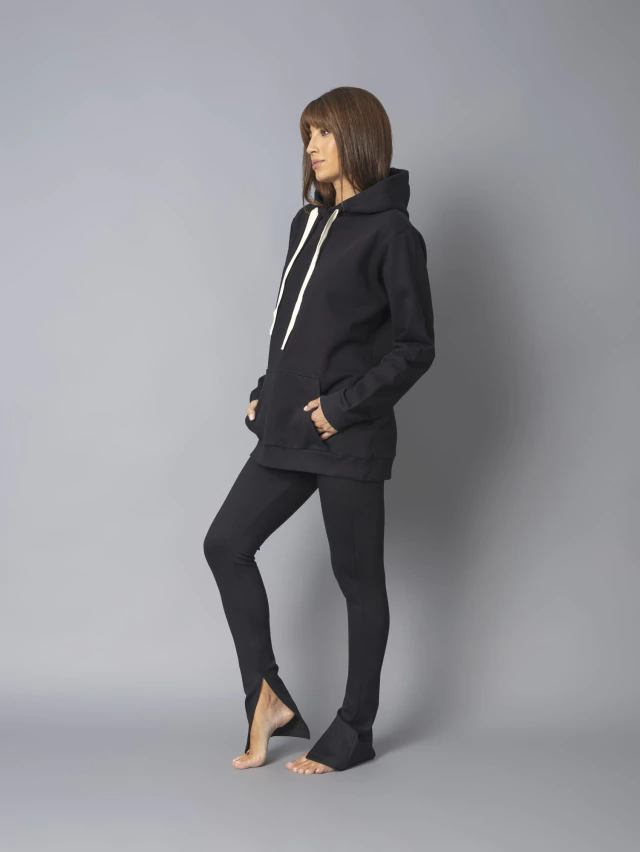 Calça com malha firme com elastano, cintura média e possui abertura na barra.